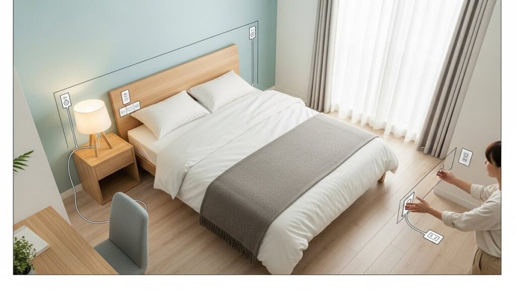 寝室のコンセント位置をベッドや家具に合わせてわかりやすく解説します。枕元のUSBやエアコン専用回線など必要な電源を見落とさないためのポイントを紹介。将来の家電や家具移動を見越した予備口や高さの目安も確認できます。 -
