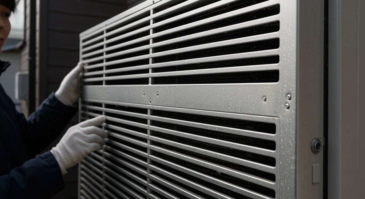 室外機のフィンやカバーの格子は埃や落ち葉で目詰まりしやすいため、季節ごとに点検と清掃を行ってください。柔らかいブラシや水洗いで丁寧に汚れを落とします。