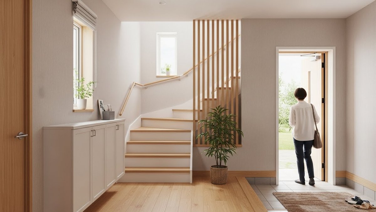 玄関を開けたときに正面やすぐそばに階段があると、来客時の印象や日常の動線が気になりますね。狭いスペースでも手を加えるだけで見た目が整い、使い勝手も良くなります。ここでは手軽にできる目隠しや収納、照明の工夫から、思い切った間取り変更まで段階的に対策を紹介します。自分の家に合う方法を選んで、玄関周りを居心地よく整えていきましょう。