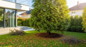 シンボルツリーにする場合は庭の中心や視線の入りやすい位置に配置します。幹を見せる仕立てにして足元に低木や照明を配すると、昼夜ともに魅力的に見えます。