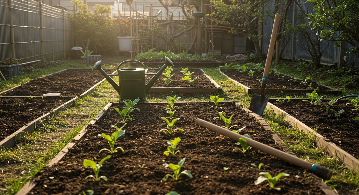 基本的な道具としては熊手、シャベル、移植ごて、除草用ホー、剪定ばさみ、ジョウロや散水ホースがあれば大抵の作業ができます。ウッドチップや砂利の敷設にはレーキや水平器があると仕上がりがきれいになります。