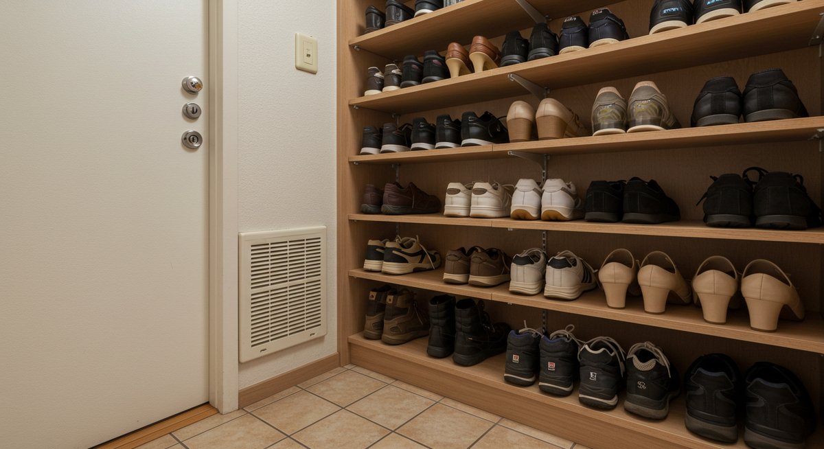 におい対策としては、通気性の良い棚材、湿気を吸収する置き型の吸湿剤、シューズ用の脱臭剤を併用すると効果的です。ブーツやスポーツシューズは湿気が多くなりがちなので、個別に通気を確保できる棚配置を検討してください。