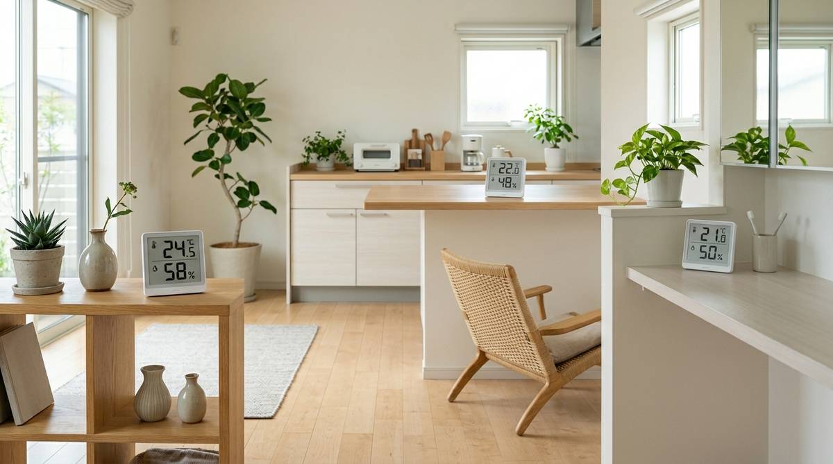 どんなに高性能なセンサーでも、設置場所が悪いと正確な数値は出せません。温湿度計プラスを購入した後は、その置き場所に注意を払いましょう。特に対流の悪い隅っこや、直射日光が当たる場所、家電の排熱が直接当たる場所は避けるべきです。