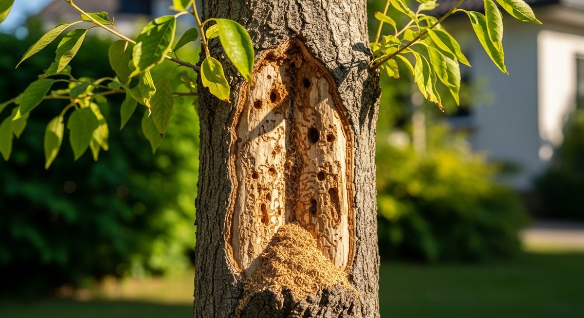 カミキリムシの被害で最も恐ろしいのは、見た目には何の問題もないように見える点です。樹皮がしっかりと残っているため、まさか中がスカスカになっているとは誰も想像できません。しかし、実際には幼虫が何本ものトンネルを掘り、木の強度を支える芯の部分までボロボロにしていることがよくあります。